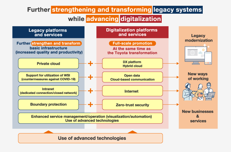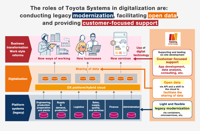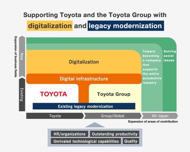 Toyota Systems will take on the challenge of ensuring a successful digital shift in order to allow Toyota and the entire Toyota Group to be among the world's top digital companies. In more specific terms, we will support Toyota and the Toyota Group through both digitalization and legacy modernization.